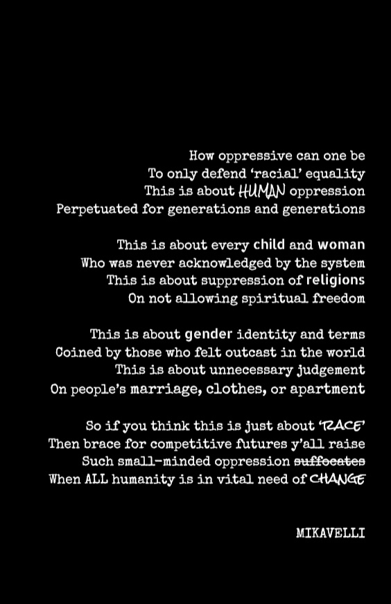 So it’s up to anyone who can comprehend this to embrace each other’s experiences, to empathise with difference of struggle, and to encourage equal expression by showing mutual respect and exerting self-control when protesting the inequalities and injustices in whichever setting you are capable (such as family, friends, community, society).